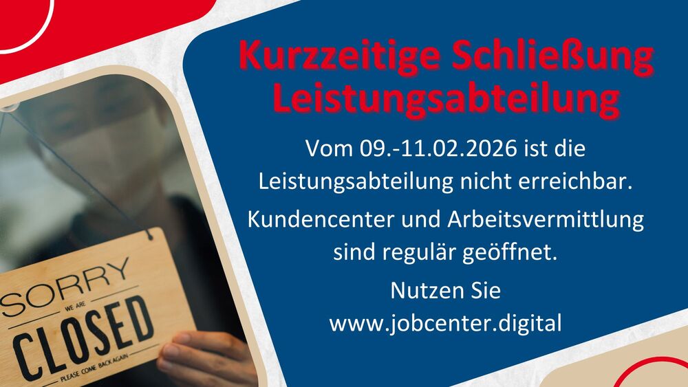 Aufgrund einer internen Umorganisation bleibt die Leistungsabteilung des Jobcenters Kreis Paderborn in allen Liegenschaften in der Zeit vom 09.-11. Februar 2026 geschlossen. Die Mitarbeitenden sind in dieser Zeit weder persönlich noch telefonisch oder digital erreichbar.